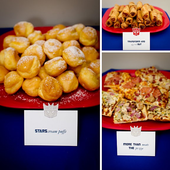 My next winning party feature goes to this awesome TRANS'FOUR'MERS BIRTHDAY PARTY submitted by Pure Joy Events. Now this woman knows how to par-tay! No detail was left out. Can you believe that cake?! And look at the Transformers made out of paper {inspiration found here}. I just love all of it. Amazing job, Christine! Thanks for your submission!