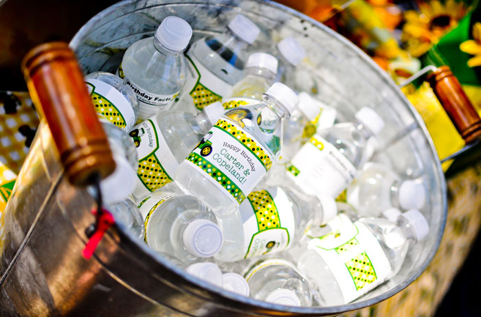 Lunch included Chick-fil-A nuggets, fruit salad, chips, pretzels, and of course candy! Abbie served Sour Patch Kids, sixlets, gumballs, sour straws, Reese's cups, Mike & Ike's, and Jolly Ranchers, all in yellow and green. She also had custom M&M's made with the boys' photos and names on them.