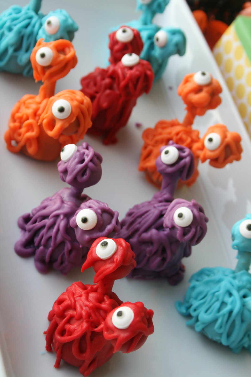 I love these monsters! The cakepops are so cute, you should send these photos to bakerella to include in her popstars section. I really love the marshmellow monsters too. What a great party theme, love all the colours.