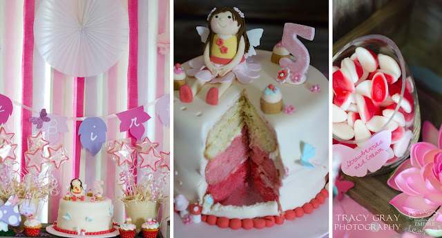 Here is what Shae said about the party- "This 5th birthday party was styled for a beautiful girl named Ruby. When choosing a theme for her party she had her favourite fairy book in hand and knew exactly what she wanted and in her favourite colours of all shades of pink and purple. We created a magical white fairy forest with acrylic crystal lavender and clear garland, beautiful butterflies and magical fairy forest door as a photobooth backdrop. Glitter and lace featured throughout the party ensuring that it was feminine, all things fairy and magical. Wooden crates and real moss covered rabbits featured around the party room to ensure the little guests felt like they were walking into a fairies forest. Purple lanterns hung from different heights at the back of the table with flickering faux candles to add depth and awe where ever the children looked. Further faux candles were added to the bird cages scattered around the sweets buffet. Rubies mother provided little pots of flowers, wit h which we added cute messages printed on a butterfly shaped card, this way the children could take a piece of the fairy forest home with them. The cake and sweet treats were created by the talented Kara from Butter Hearts Sugar butterheartssugar.blogspot.com/ and the photography delightfully taken by Tracy Gray Photography (no webpage). Styling & Graphic Design - Enchanted Empire www.enchantedempire.com.au and all linen and hire goods from Enchanted Emporium www.enchantedemporium.com.au."